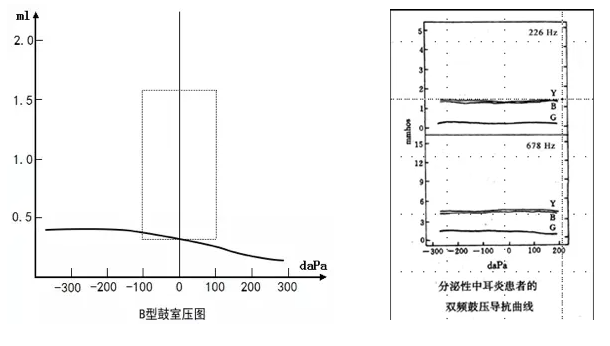典型表现为 B 型鼓室图(无明确压力峰值,导纳值 <0.3mmho),双频测试(226Hz+1kHz)显示低频曲线幅度减低,高频曲线呈波浪状波动,静态导纳显著降低,“峰尾差”<0.2mmho,客观证实中耳积液存在,为临床穿刺或药物治疗提供依据。